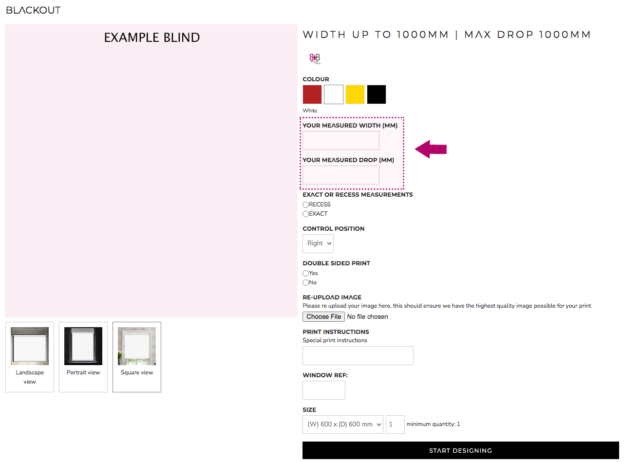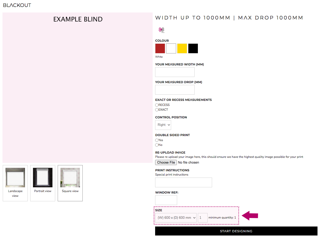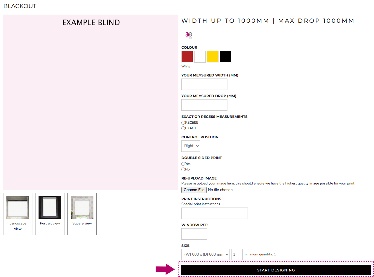 Select the correct orientation of your blind; Square, Portrait or Landscape. Then start your designing!