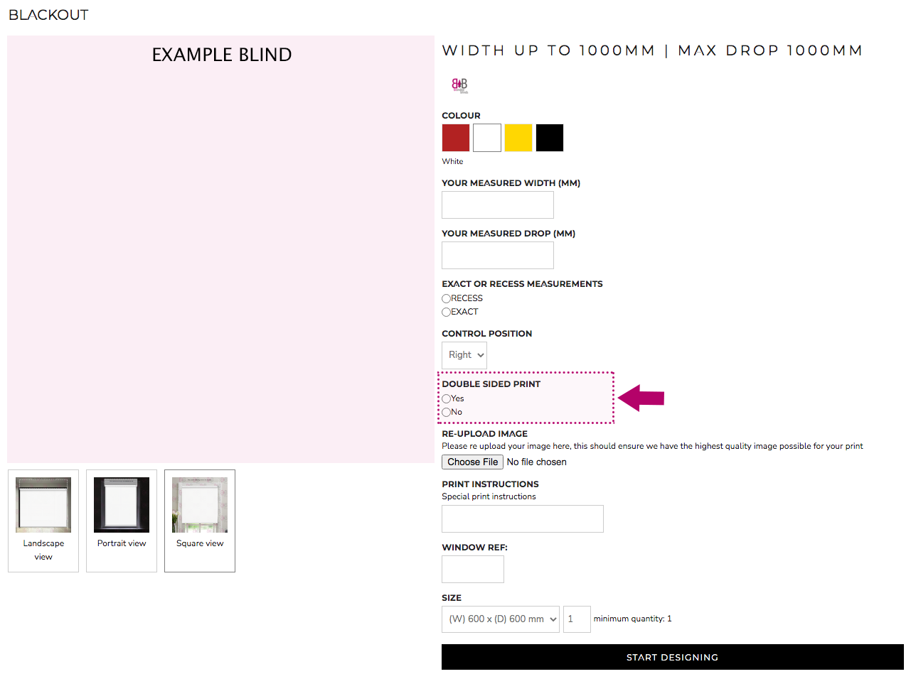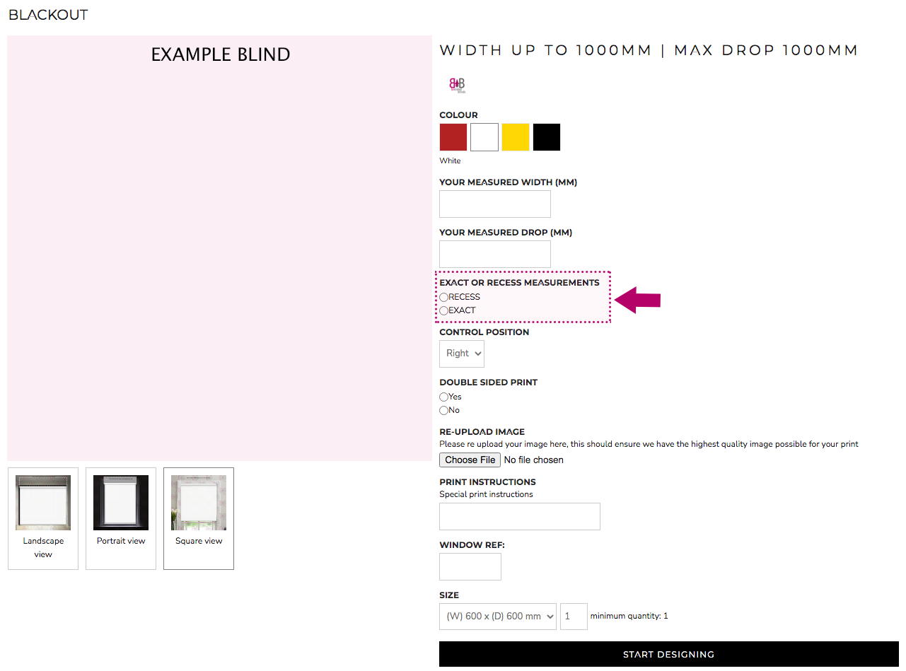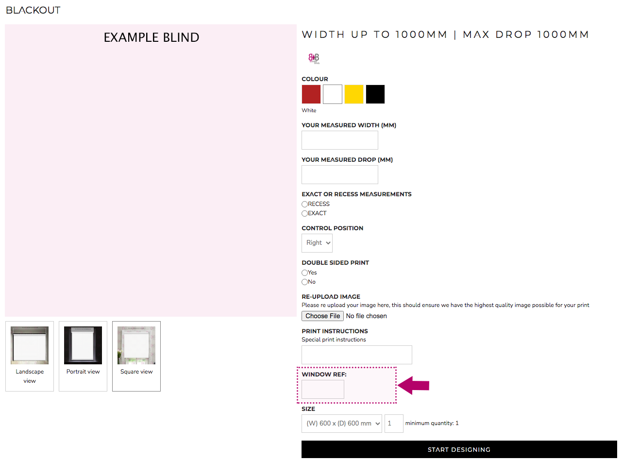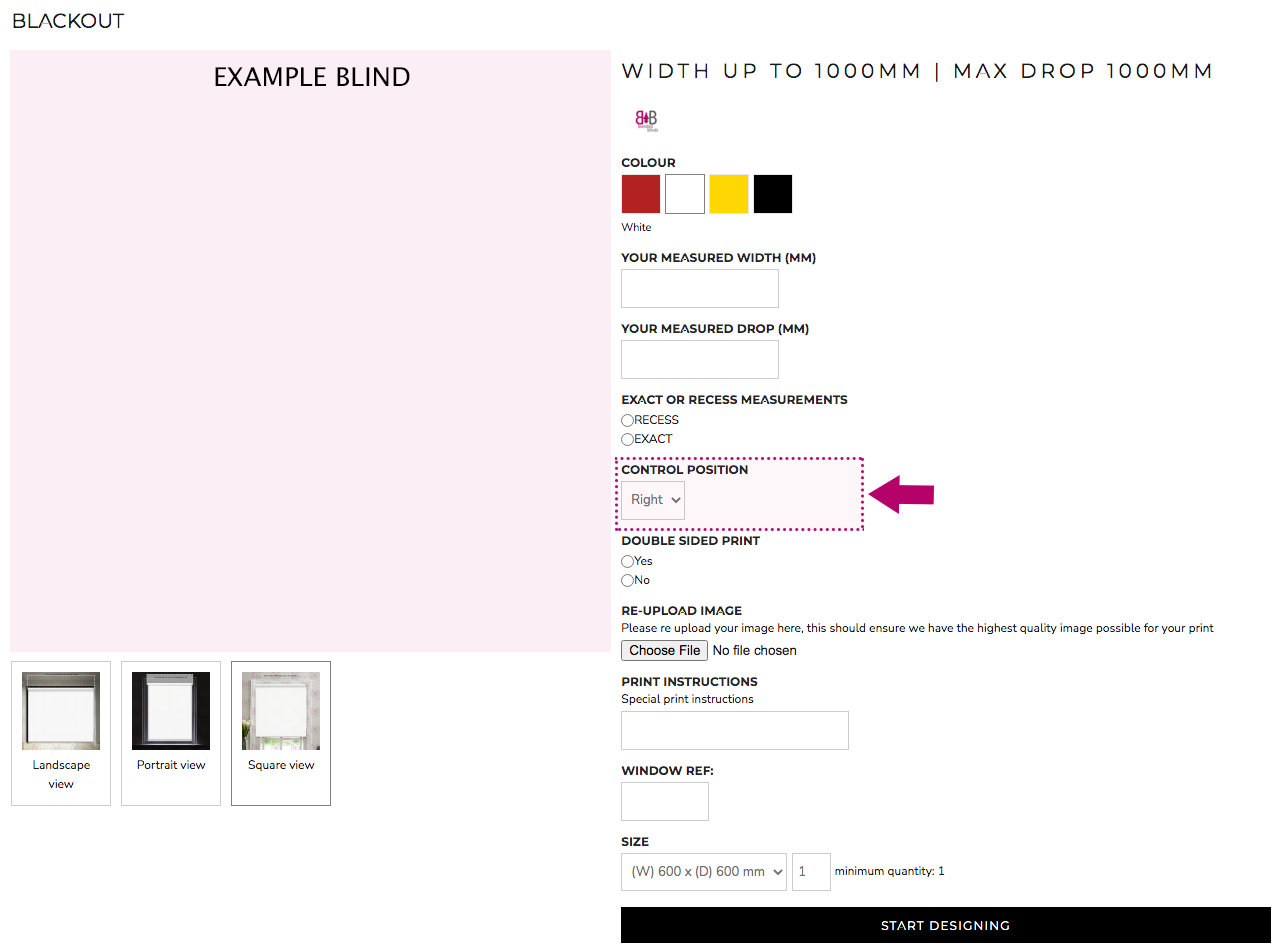 Select the correct orientation of your blind; Square, Portrait or Landscape. Then start your designing!